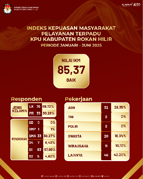Bagansiapiapi - kepuasan Anda merupakan motivasi bagi Kami! Berikut disampaikan Indeks Kepuasan Masyarakat (IKM) terhadap KPU Kabupaten Rokan Hilir pada periode Januari s/d Juni 2025.