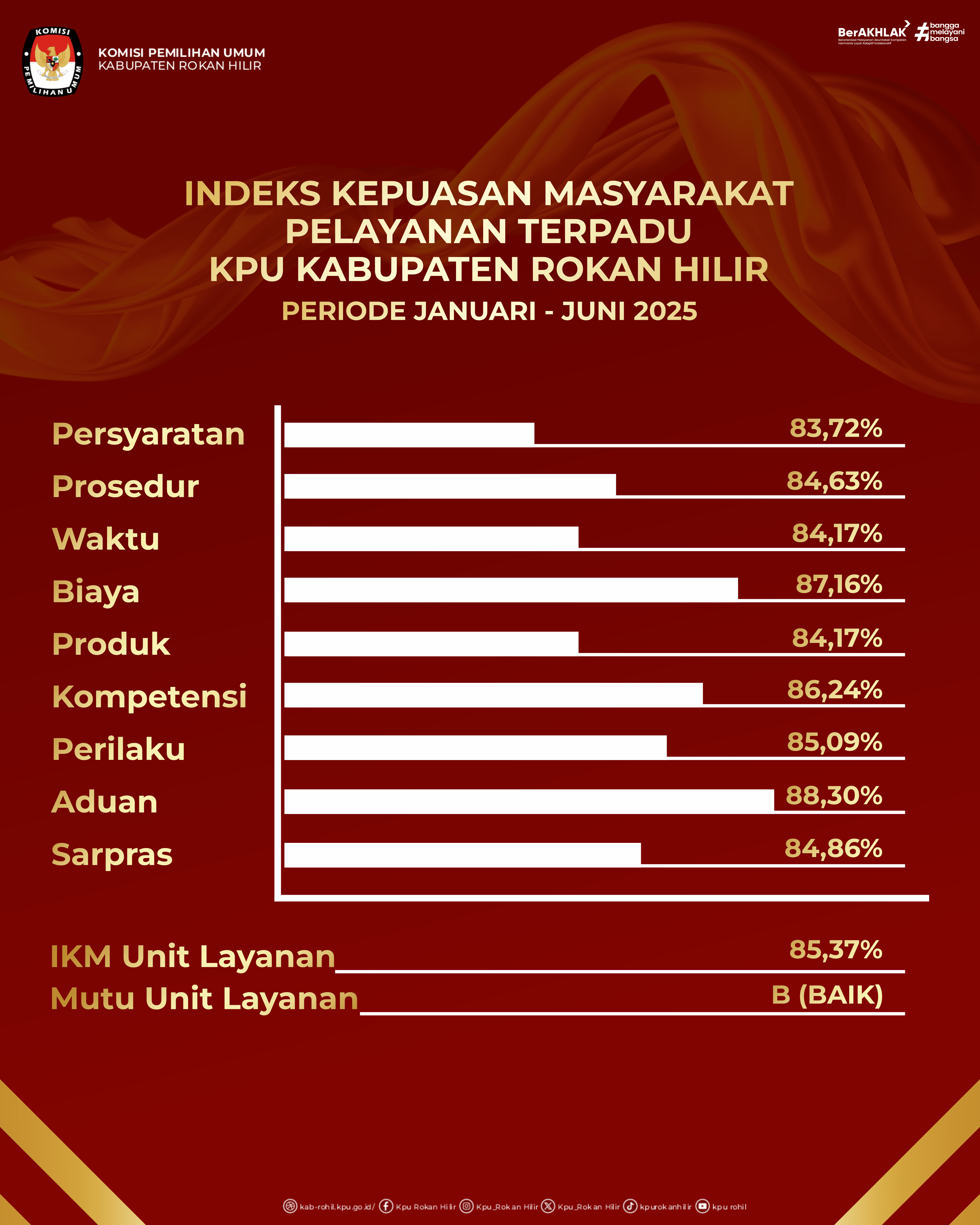 Terima kasih atas kepercayaan dan partisipasi #temanpemilih telah memberikan penilaian Indeks Kepuasaan Masyarakat (IKM) Pelayanan Publik Terpadu Komisi Pemilihan Umum Kabupaten Rokan Hilir Periode Januari-Juni 2025 sehingga memperoleh penilaian IKM 85,37 atau Baik.