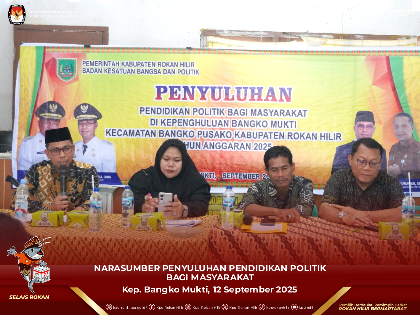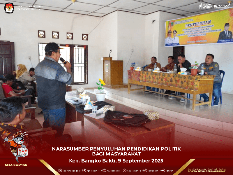 Ketua KPU Rokan Hilir, Eka Murlan juga membersamai Kesbangpol Rokan Hilir dalam penyuluhan ini dengan menjadi narasumber pada 3 (tiga) Kepenghuluan/Kelurahan sekaligus, Kepenghuluan Bangko Permata, Kelurahan Bangko Kanan dan kepenghuluan Bangko Mukti selama 3 (tiga) hari berturut-turut sejak Rabu (10/9/2025) sampai dengan Jum'at (12/9/2025).
