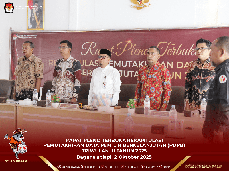Bagansiapiapi - Ketua KPU Kabupaten Rokan Hilir, Eka Murlan didampingi Anggota KPU Rokan Hilir lainnya, Kaswanto Dahlan, Datuk Zulhidayat, Suryadi dan M. Mukhlis memimpin Rapat pleno terbuka pemutakhiran data pemilih berkelanjutan (PDPB) triwulan III tahun 2025 di Media Center KPU Rokan Hilir, Bagansiapiapi, Kamis (2/10/2025).