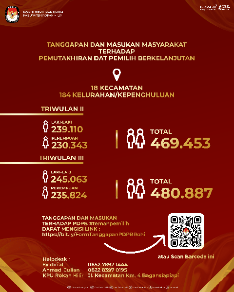 #temanpemilih dapat memberikan tanggapan dan masukan melalui link : https://bit.ly/FormTanggapanPDPBRohil atau scan Barcode yang tersedia.