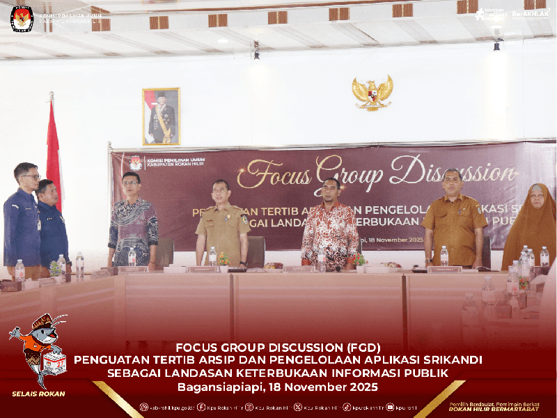 Bagansiapiapi - Anggota KPU Rokan Hilir, Suryadi membuka Focus Group Discussion (FGD) Penguatan Tertib Arsip dan Pengelolaan Aplikasi Srikandi sebagai landasan keterbukaan informasi publik di Media Center KPU Rokan Hilir, Bagansiapiapi pada Selasa (18/11/2025).
