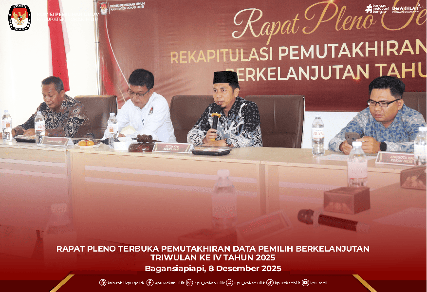Bagansiapiapi - Ketua KPU Kabupaten Rokan Hilir, Eka Murlan memimpin Rapat Pleno Terbuka Rekapitulasi Pemutakhiran Data Pemilih Berkelanjutan (PDPB) Triwulan IV Tahun 2025 di Media Center KPU Rokan Hilir Bagansiapiapi, Senin (8/12/2025).