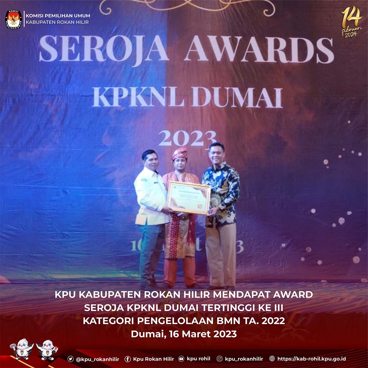 KPU Kabupaten Rokan Hilir mendapat award Seroja KPKNL Dumai Tertinggi ke III kategori pengelolaan BMN TA. 2022