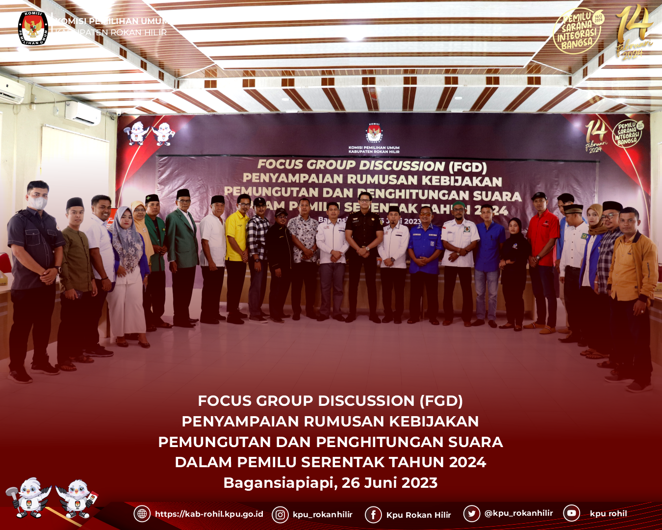 KPU Kabupaten Rokan Hilir melakukan Focus Group Discussion (FGD) penyampaian rumusan kebijakan pemungutan dan penghitungan suara dalam pemilu serentak tahun 2024 yang dilaksanakan dimedia center KPU Rokan Hilir, Senin (26/6/2023).