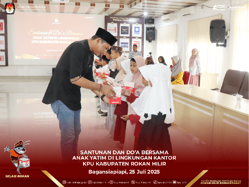 Bagansiapiapi - KPU Kabupaten Rokan Hilir laksanakan Santunan dan Do'a Bersama Anak Yatim di lingkungan Kantor KPU Kabupaten Rokan Hiliir pada Jum'at (25/7/2025) di Media Center KPU Kabupaten Rokan Hilir, Bagansiapiapi.