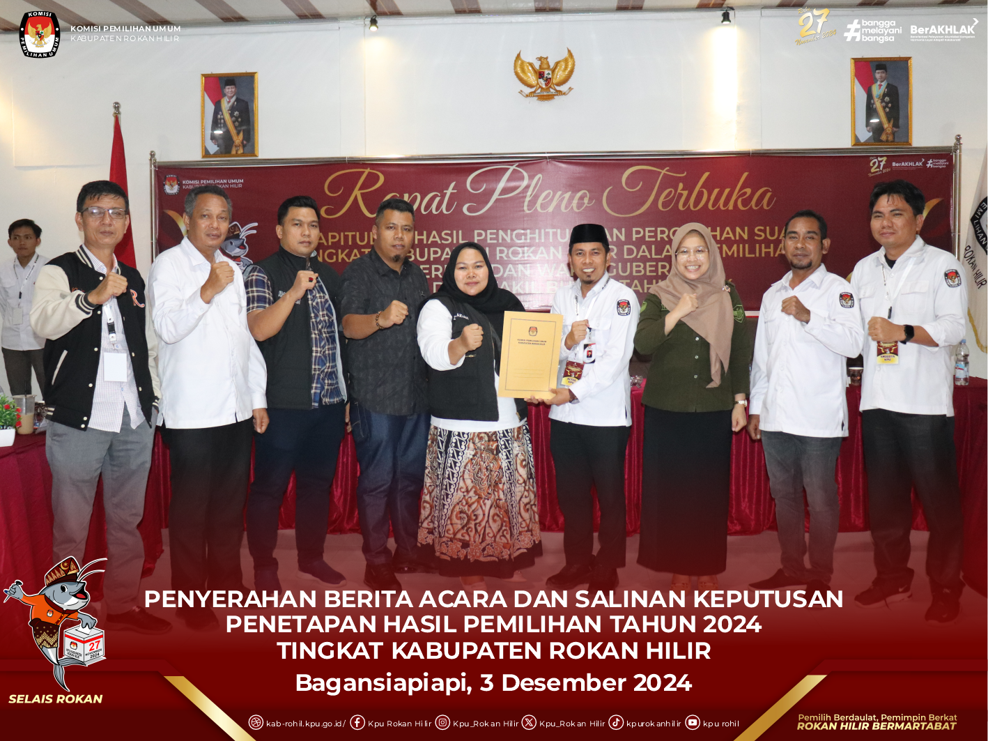 #temanpemilih KPU Kabupaten Rokan Hilir menyerahkan Berita Acara dan Salinan Keputusan Penetapan Hasil Pemilihan Tahun 2024 Tingkat Kabupaten Rokan Hilir Kepada Bawaslu Rokan Hilir dan Para Saksi Pasangan Calon Gubernur dan Wakil Gubernur serta Bupati dan Wakil Bupati di Media Center KPU Rokan Hilir, Bagansiapiapi (3/12/2024).