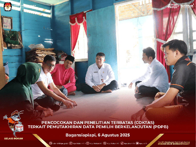 Bagansiapiapi - Anggota KPU Kabupaten Rokan Hilir, Kaswanto Dahlan didampingi Sekretariat KPU Rokan Hilir melaksanakan Pencocokan dan Penelitian Terbatas (Coktas) terkait Pemutakhiran Data Pemilih Berkelanjutan (PDPB), Bagansiapiapi, Rabu (6/8/2025).