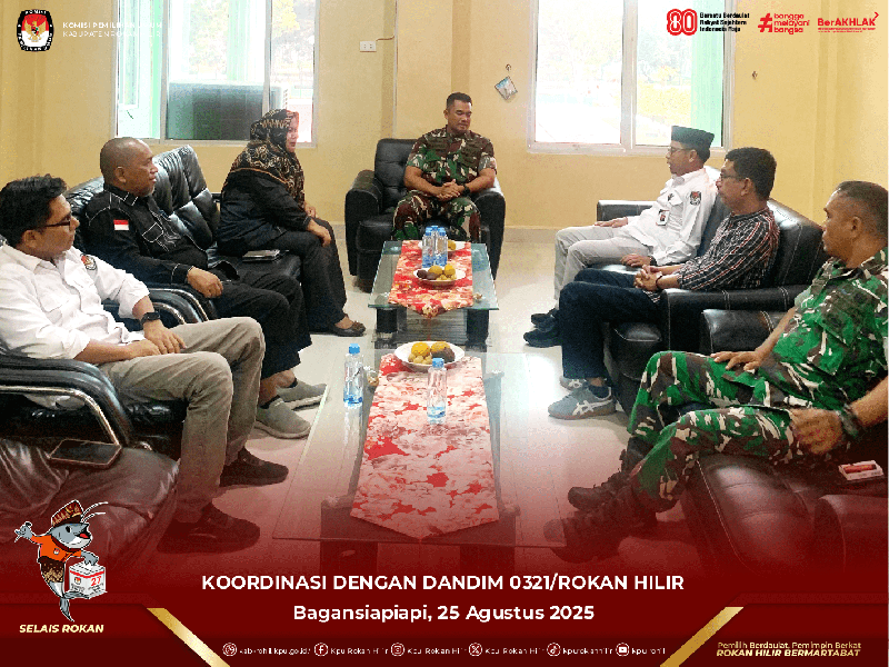 Bagansiapiapi - Ketua KPU Rokan Hilir, Eka Murlan didampingi oleh Anggota KPU Rokan Hilir lainnya, Kaswanto Dahlan dan M. Mukhlis berkoordinasi dengan Dandim 0321/Rokan Hilir, di Markas Komando Distrik Militer 0321/Rokan Hilir, Bagansiapiapi, Senin (25/8/2025).
