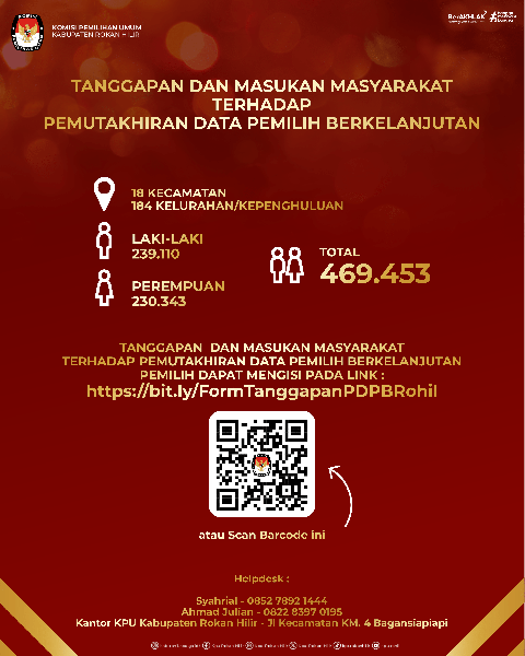 #temanpemilih dapat memberikan tanggapan dan masukan melalui link : https://bit.ly/FormTanggapanPDPBRohil atau scan Barcode yang tersedia.