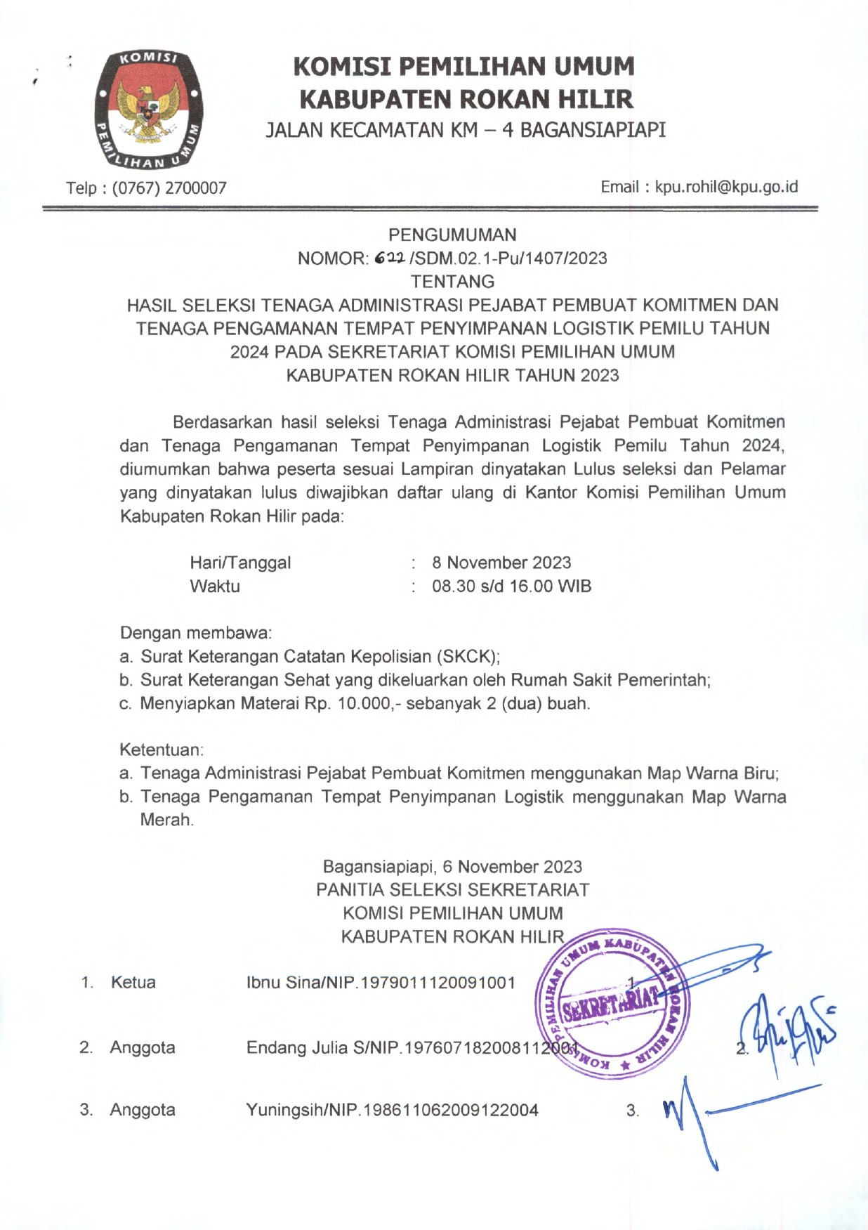 BERIKUT DISAMPAIKAN PENGUMUMAN HASIL SELEKSI TA PEJABAT PEMBUAT KOMITMEN DAN TENAGA PENGAMANAN TEMPAT PENYIMPANAN LOGISTIK PEMILU TAHUN 2024