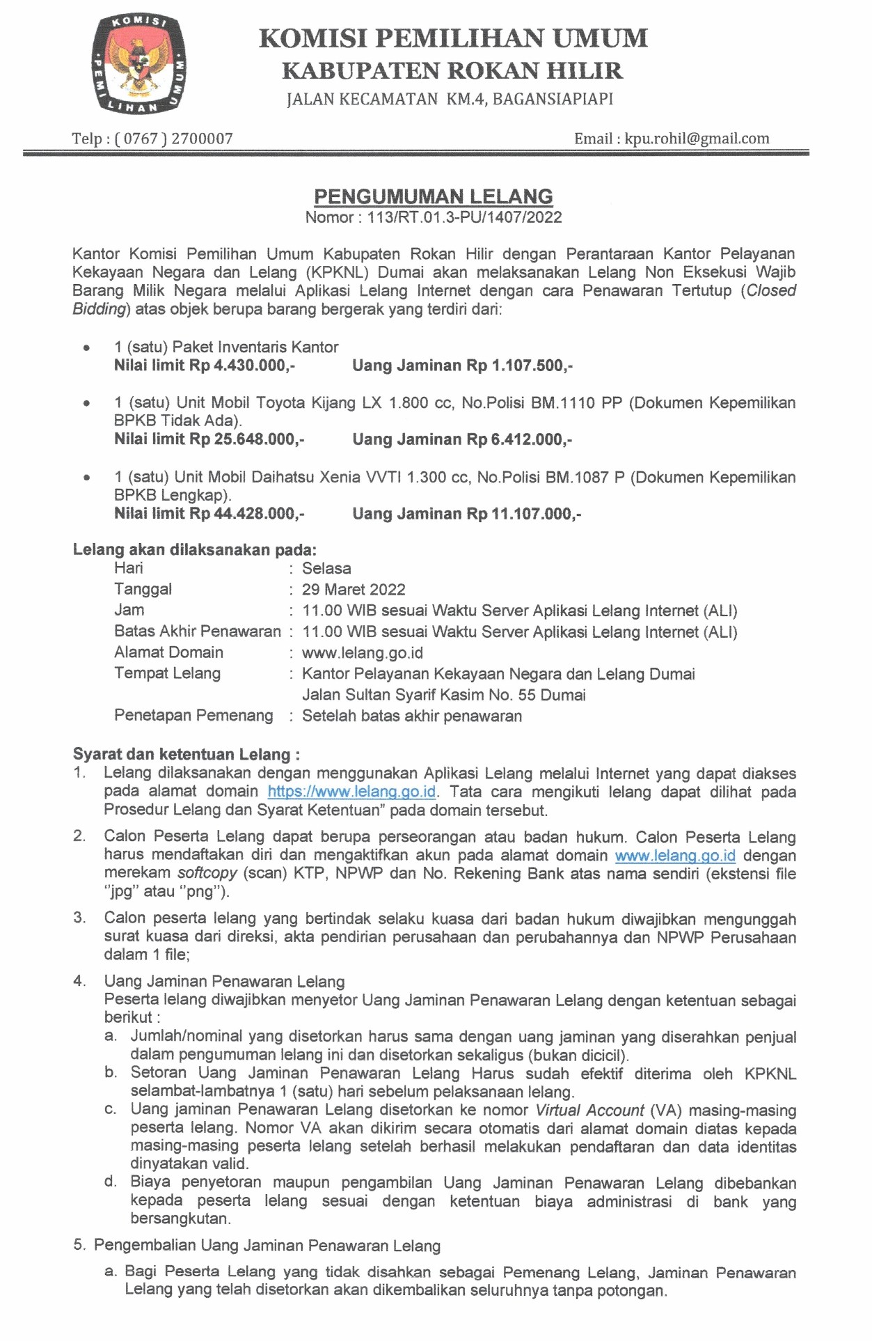 Kantor Komisi Pemilihan Umum Kabupaten Rokan Hilir dengan perantaraan Kantor Pelayanan Kekayaan Negara dan Lelang Dumai akan melaksanakan lelang non eksekusi wajib Barang Milik Negara melalui aplikasi lelang internet dengan cara penawaran tertutup (closed bidding) atas objek berupa barang bergerak.