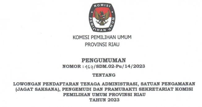 Berikut Disampaikan Pengumuman Nomor : 467/SDM.02-Pu/14/2023 Tentang Lowongan Pendaftaran Tenaga Administrasi, Satuan Pengamanan (Jagat Saksana), Pengemudi dan Pramubakti Sekretariat KPU Provinsi Riau Tahun 2023.