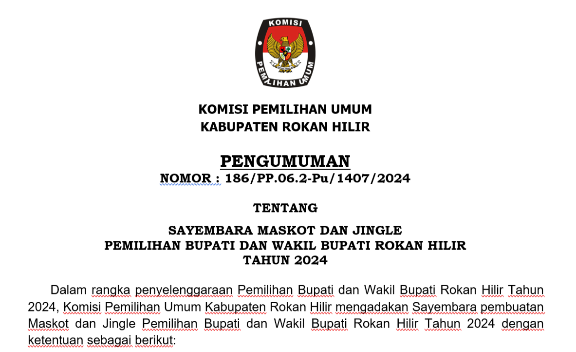 Dalam rangka perpanjangan waktu pendaftaran pelaksanaan sayembara Maskot dan Jingle Pemilihan Bupati dan Wakil Bupati Rokan Hilir Tahun 2024, Komisi Pemilihan Umum Kabupaten Rokan Hilir dengan ini mengumumkan perubahan Pengumuman Sayembara pembuatan Maskot dan Jingle Pemilihan Bupati dan Wakil Bupati Rokan Hilir Tahun 2024.