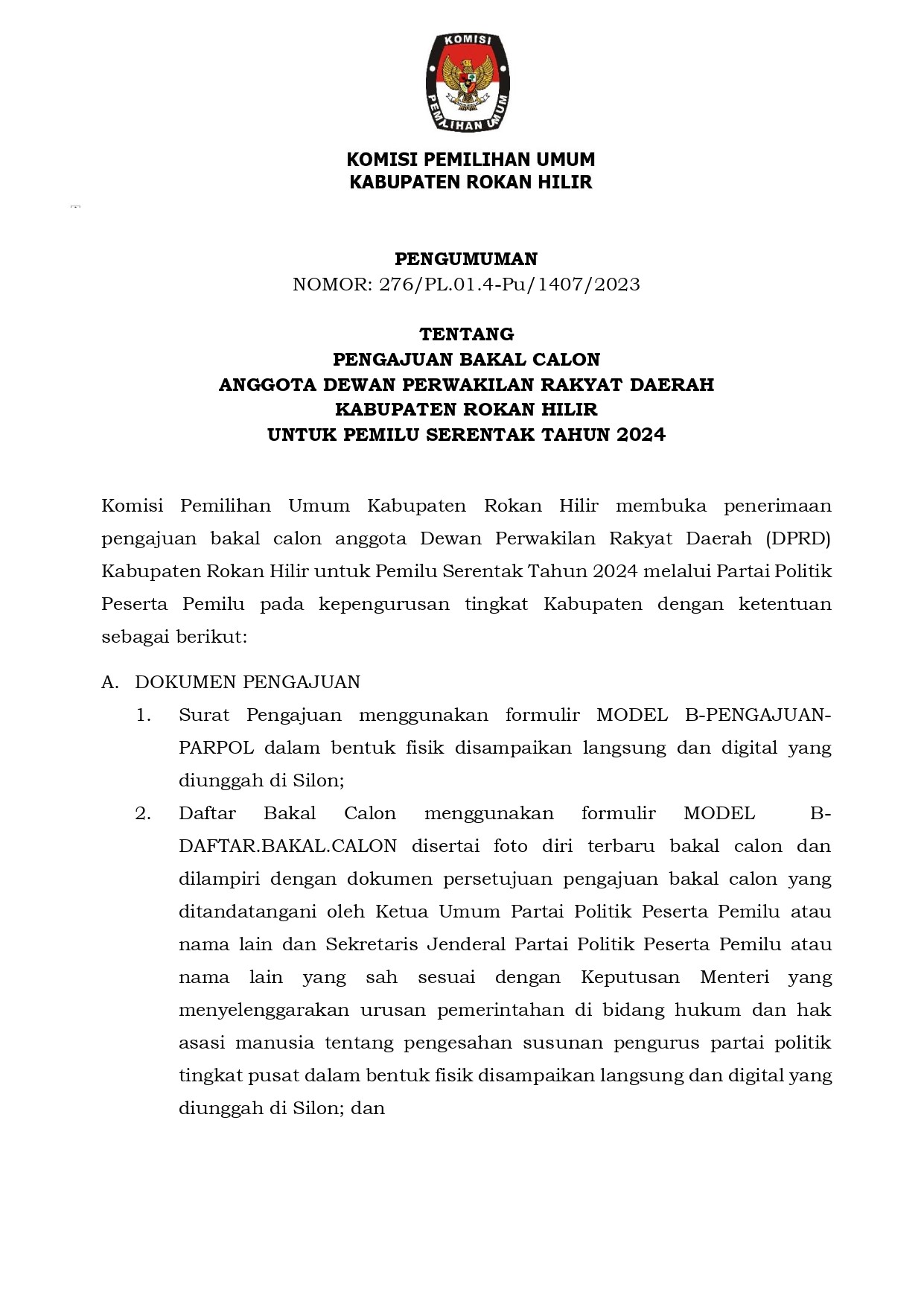 PENGUMUMAN PENGAJUAN BAKAL CALON ANGGOTA DEWAN PERWAKILAN RAKYAT DAERAH KABUPATEN ROKAN HILIR UNTUK PEMILU SERENTAK TAHUN 2024