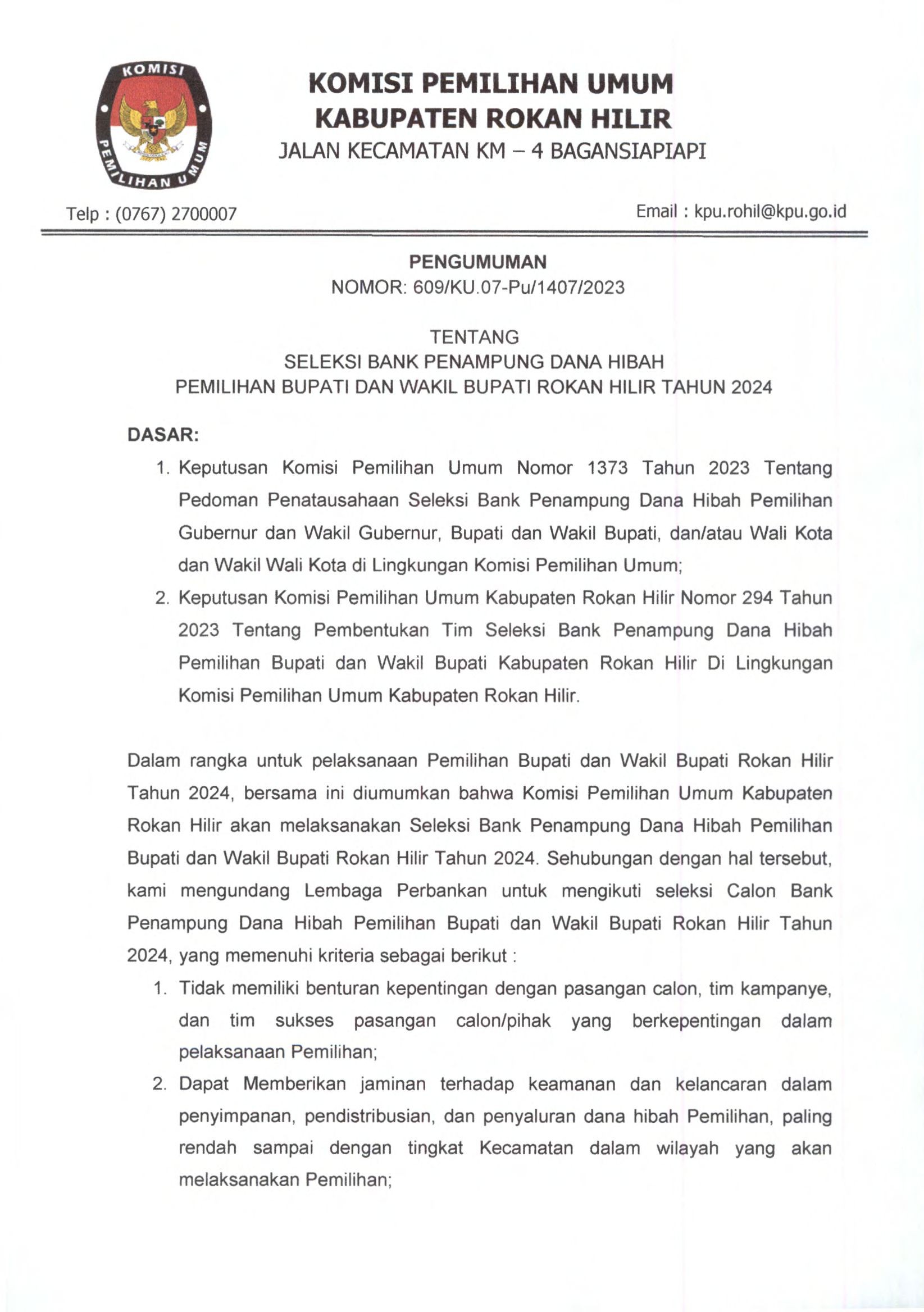 PENGUMUMAN SELEKSI BANK PENAMPUNG DANA HIBAH PEMILIHAN BUPATI DAN WAKIL BUPATI KABUPATEN ROKAN HILIR TAHUN 2024