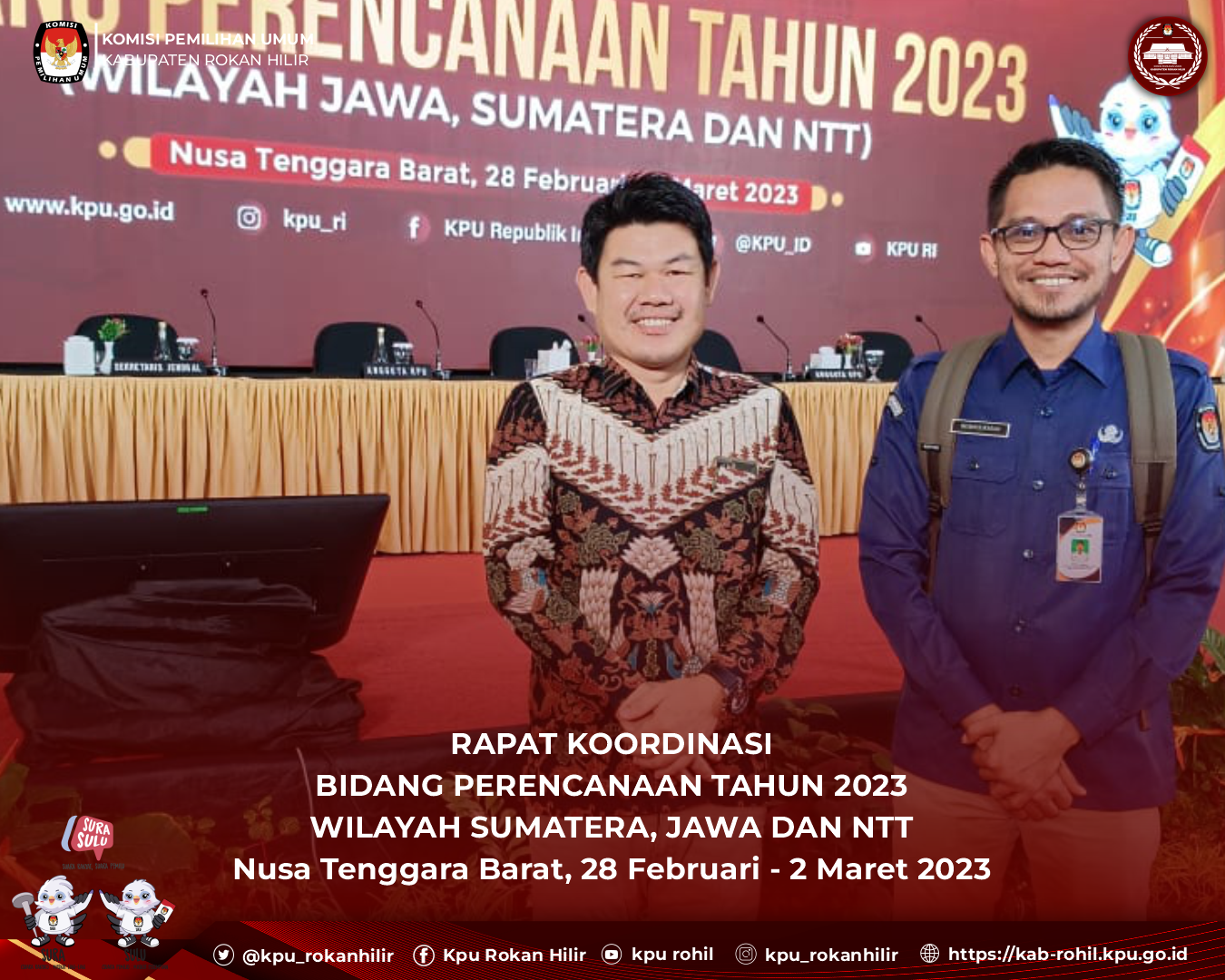 #TemanPemilih, Anggota KPU Rokan Hilir, Hendra didampingi oleh Plt. Sekretaris KPU Rokan Hilir menghadiri Rapat Koordinasi Bidang Perencanaan Tahun 2023 (Wilayah Jawa, Sumatera, dan NTT) di Lombok, Nusa Tenggara Barat, Rabu (1/3/2023).