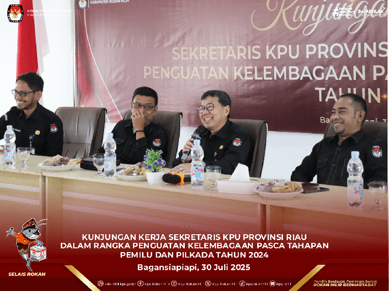 Bagansiapiapi - KPU Kabupaten Rokan Hilir menerima Kunjungan Kerja Sekretaris KPU Provinsi Riau, Rudinal B. dalam rangka penguatan kelembagaan pasca tahapan pemilu dan pemilihan tahun 2024 di Media Center KPU Rokan Hilir, Bagansiapiapi, Rabu (30/7/2025).