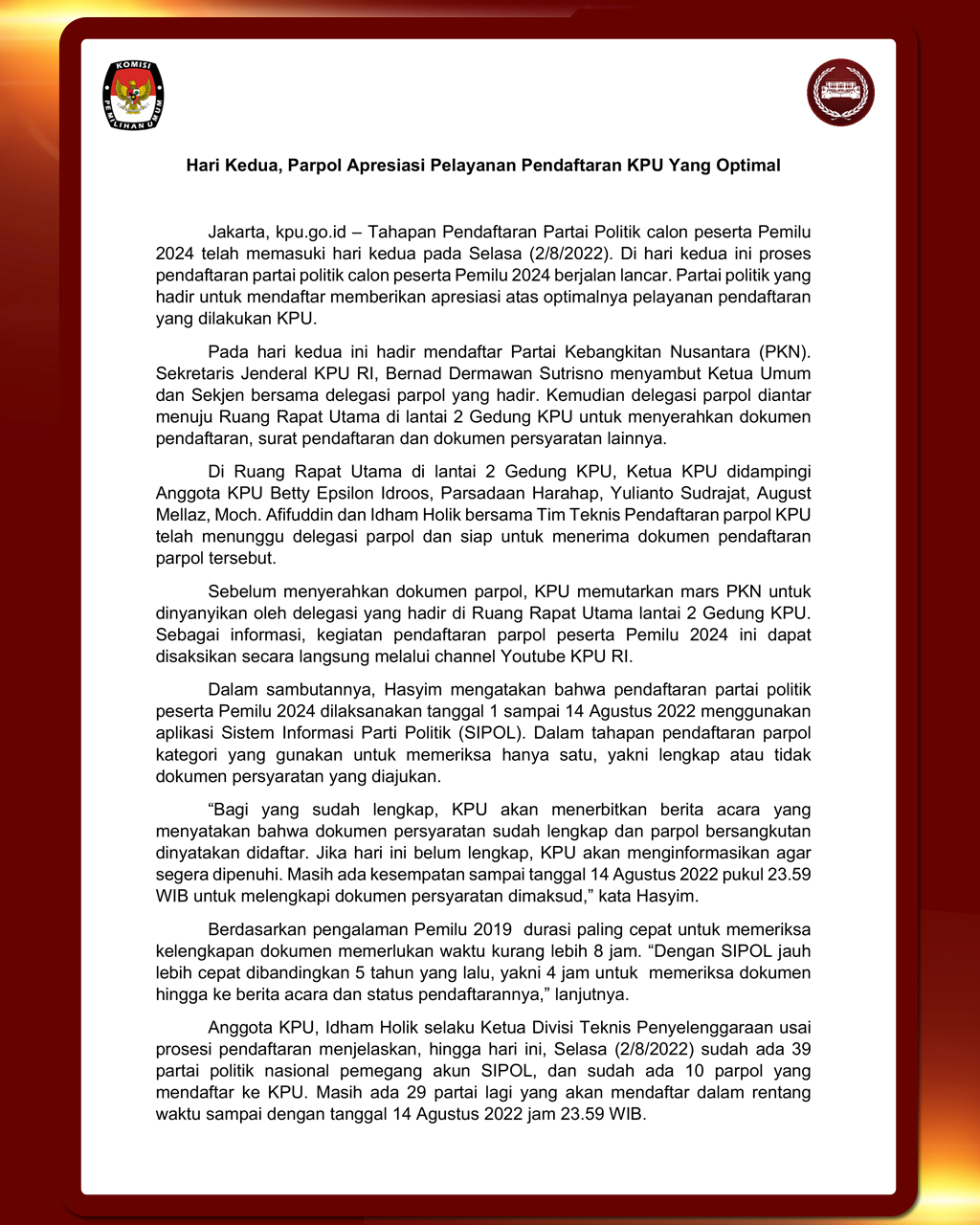 Link : https://kab-rohil.kpu.go.id/public/kab-rohil/dmdocument/1659456466PERS RILIS_2 AGUSTUS_Hari Kedua, Parpol Apresiasi Pelayanan Pendaftaran KPU Yang Optimal.pdf