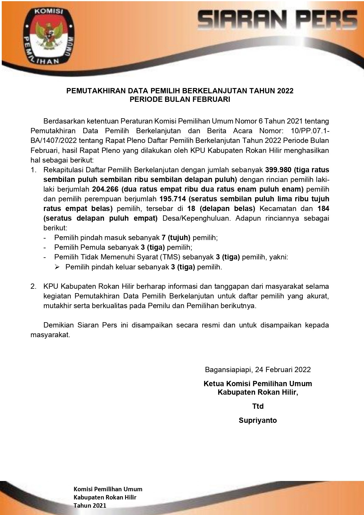 Komisi Pemilihan Umum Kabupaten Rokan Hilir dengan ini mengumumkan Siaran Pers Rekapitulasi Hasil Pemutakhiran Daftar Pemilih Berkelanjutan Periode Bulan Februari Tahun 2022 tingkat Kabupaten Rokan Hilir