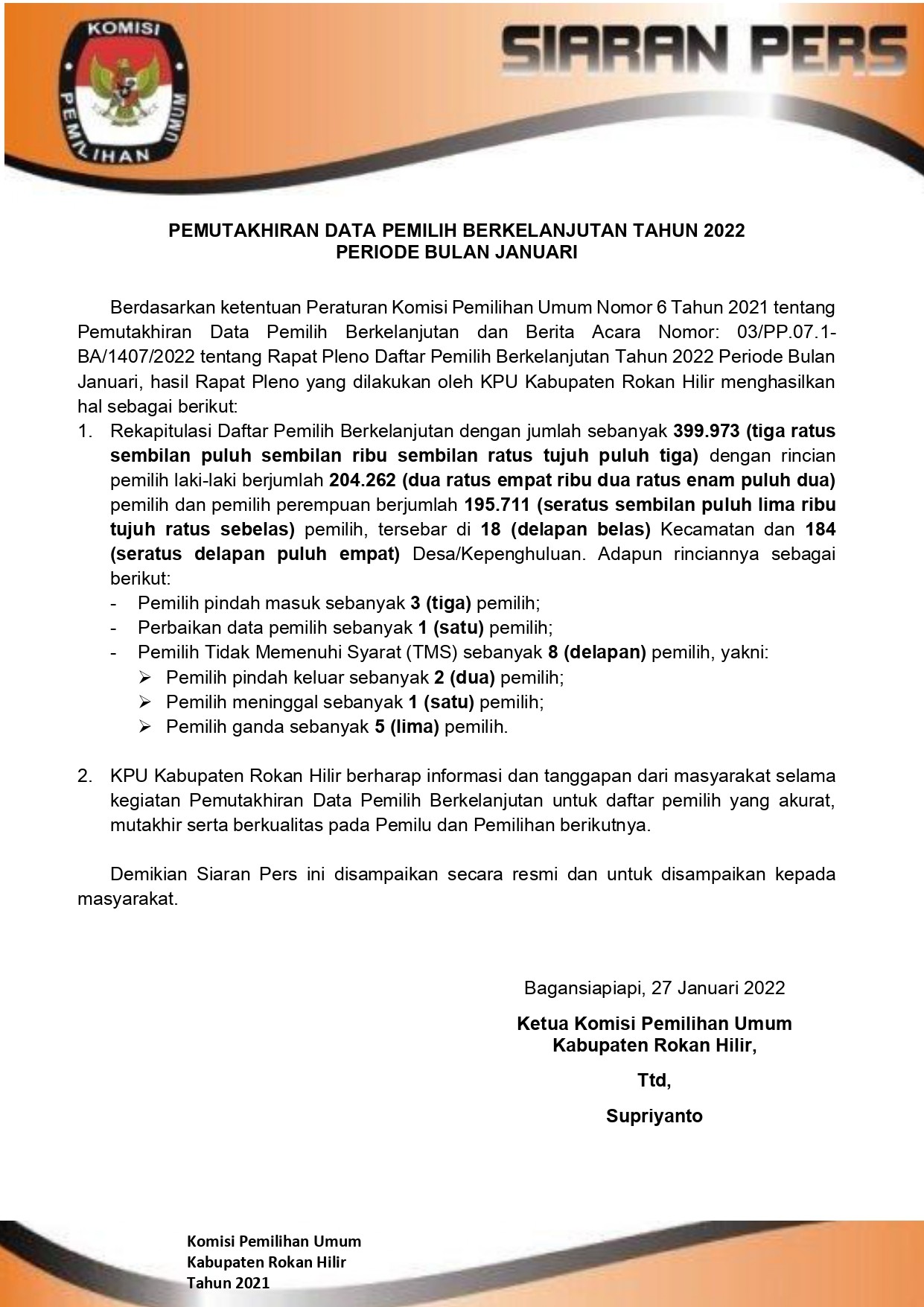 Siaran Pers Rekapitulasi Pemutakhiran Data Pemilih Berkelanjutan Periode Bulan Januari Tahun 2022 Tingkat Komisi Pemilihan Umum Kabupaten Rokan Hilir